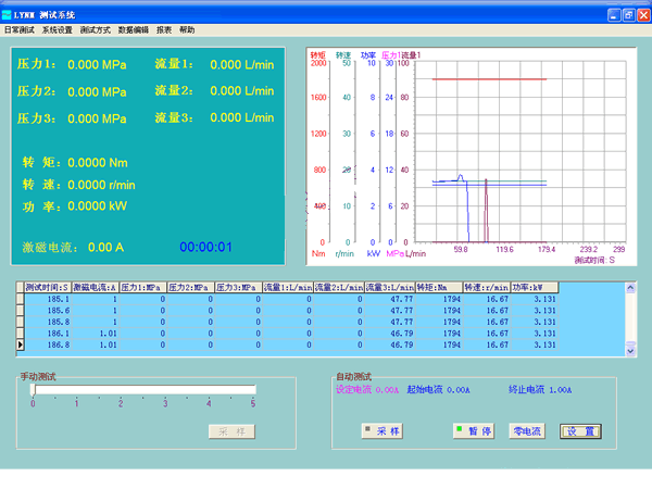 1. 系統(tǒng)通過1臺相位差式轉(zhuǎn)矩轉(zhuǎn)速傳感器及1臺TR-1C轉(zhuǎn)矩轉(zhuǎn)速采集儀(或TR-1D轉(zhuǎn)矩轉(zhuǎn)速采集儀)采集馬達的輸出轉(zhuǎn)矩和轉(zhuǎn)速;用1臺LY-1型數(shù)據(jù)采集儀采集流量和壓力;用1臺TEM-2溫度采集儀檢測溫升;用WLK-3B程控電源控制磁粉制動器對馬達進行加載。